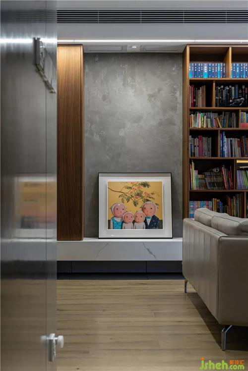 鞋柜和書柜中間的墻面放棄了原來設(shè)計的石材,而是改用了質(zhì)樸的仿水泥漆,是整個空間的留白之處,在一堆木飾面中留了一個氣孔。掛上象征全家福的版畫,成了最上鏡的拍照背景。