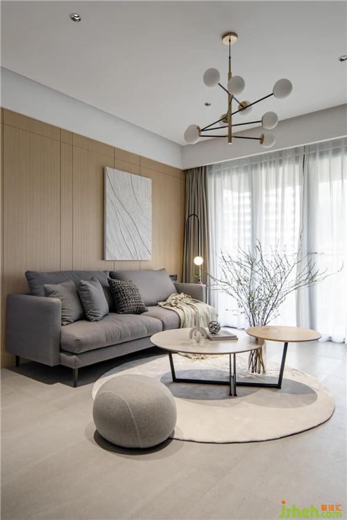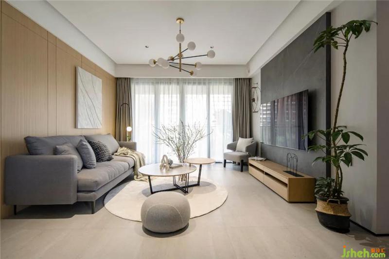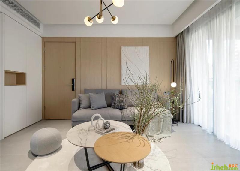 木飾面背景墻將沙發(fā)區(qū)域包圍,包括門的材質(zhì)保持一致性,讓沙發(fā)背景墻形成一個整體.