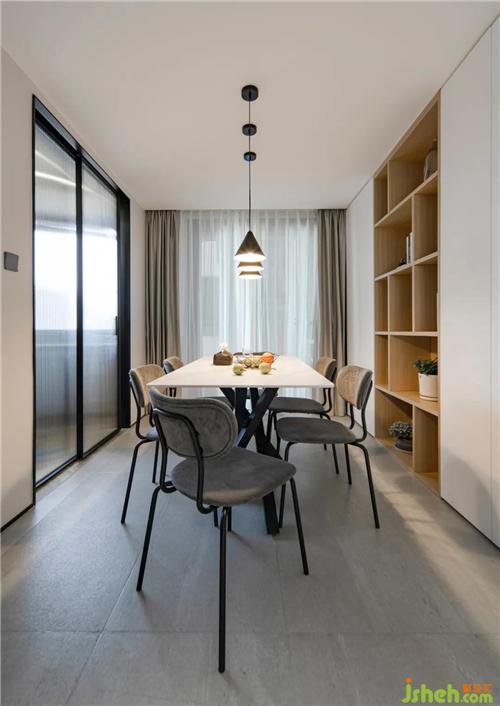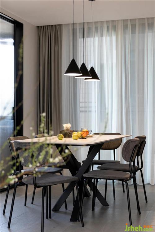 餐廳區(qū)域在家具的選擇上,大理石臺面的餐桌與體型較輕巧的灰色餐椅組合,具備質(zhì)感卻不會顯得笨重。