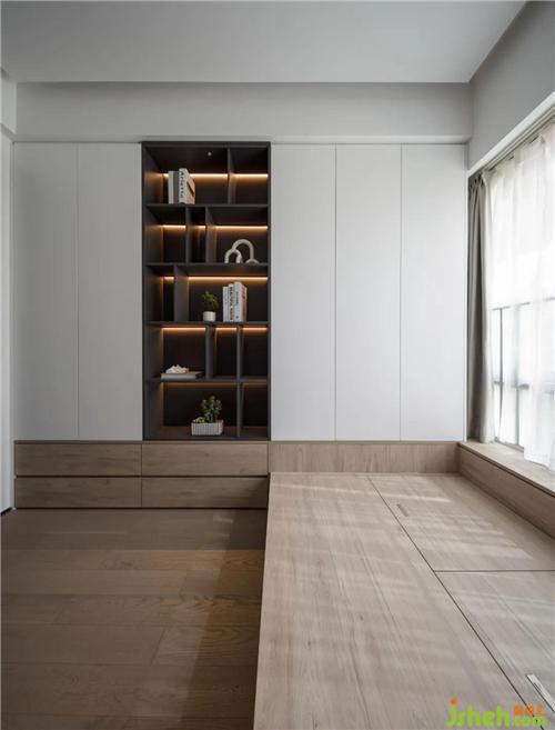 采用榻榻米的設(shè)計(jì),增加了儲物功能,也能滿足家中長輩偶爾入住的需求。床尾做了一面開放+封閉式的柜子,封閉式柜子儲物功能十分強(qiáng)大,換季的衣物及被褥統(tǒng)統(tǒng)都能放進(jìn)去。