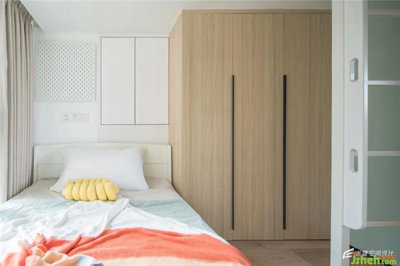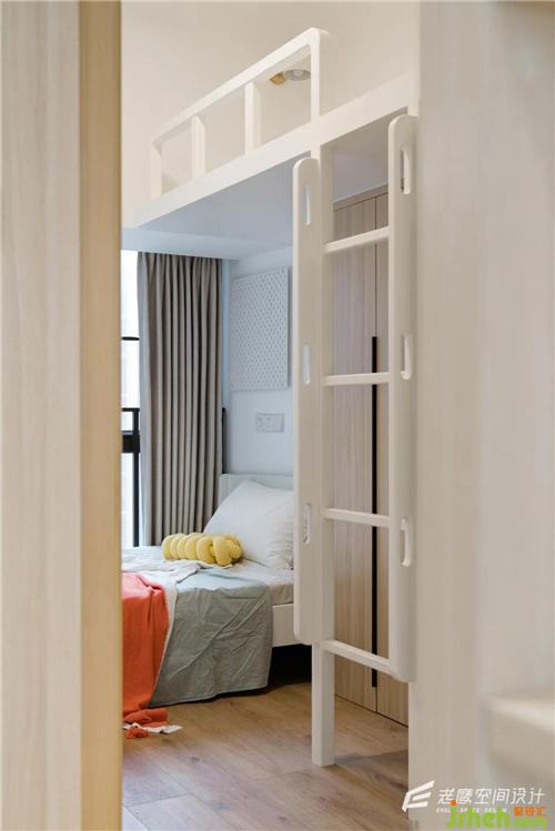 兒童房是錯(cuò)位上下鋪的設(shè)計(jì),上鋪的底部為衣柜區(qū)域,小小的空間也可以滿足儲(chǔ)物和日常使用的功能深圳室內(nèi)設(shè)計(jì)師,整個(gè)空間內(nèi)部還是以白色+木色為主,加上果綠的色調(diào)點(diǎn)綴,軟裝上用比較童趣的彩虹色,氛圍感十足