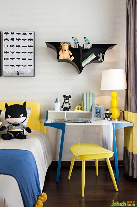 兒童房色調(diào)與整體空間色調(diào)稍有差異,設(shè)計(jì)師選擇了高飽和度的藍(lán)、黃二色,超級(jí)英雄系列作為崇拜感、歸屬感、安全感的集合體,為活潑跳躍的空間氛圍注入一絲安定、寧靜。設(shè)計(jì)公司