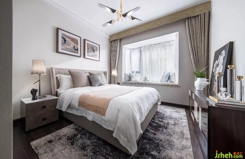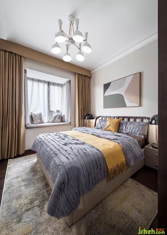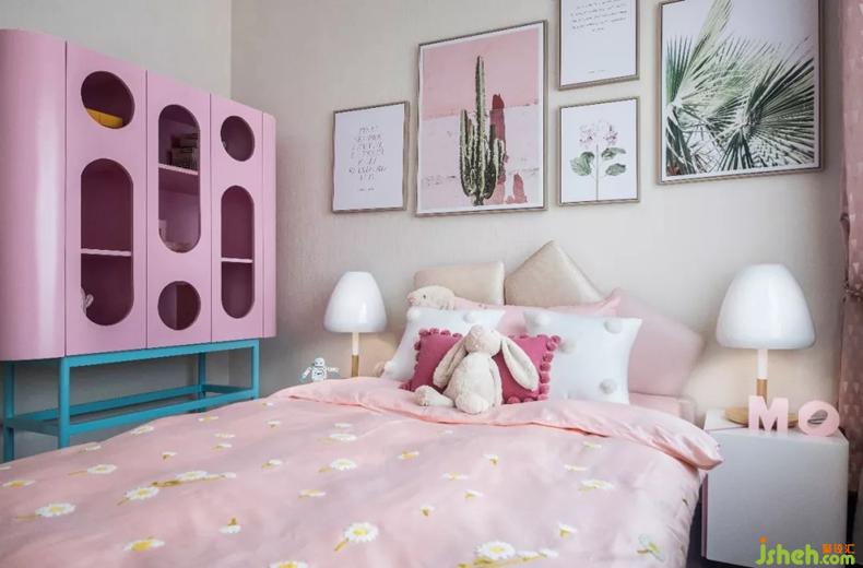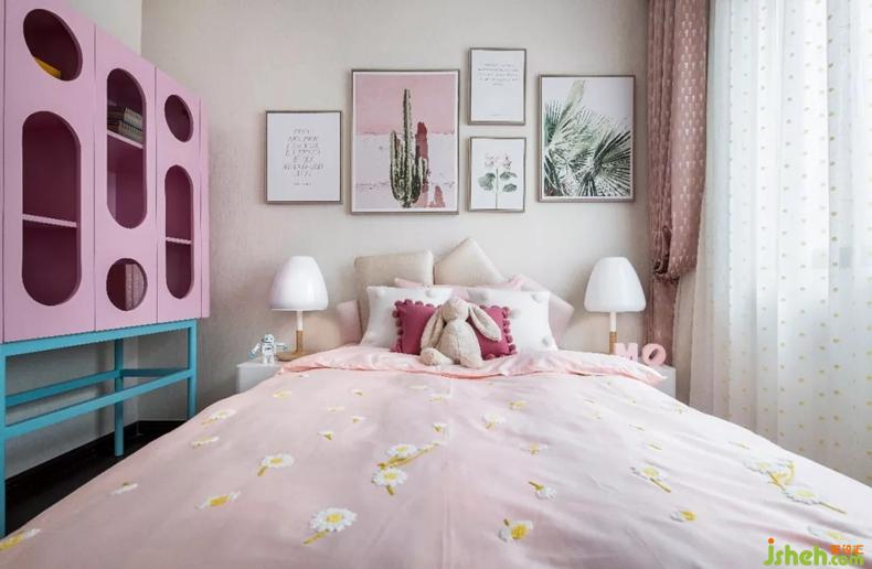 睡眠空間可以很優(yōu)雅,也可以很知性。設(shè)計師保留米色背景,再選用海星藍(lán)、香檳金、橡皮粉等床品,營造浪漫、柔和的氛圍。