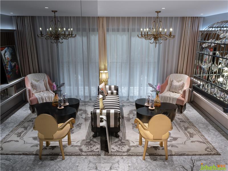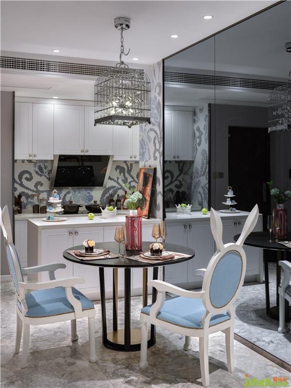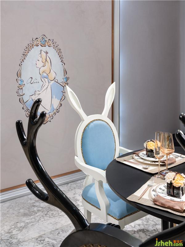 餐廳區(qū)鳥籠外框的水晶吊燈,撥轉(zhuǎn)時鐘的吊針,兔子先生再也不會被遲到困擾。鏡面照映,仿佛定格在森林的幻象之中,長出兔子耳朵、鹿角的餐廳座椅與鳥籠是森林中格格不入的外來者,是掩藏在荒誕不經(jīng)外表下的夢境。深圳裝修公司