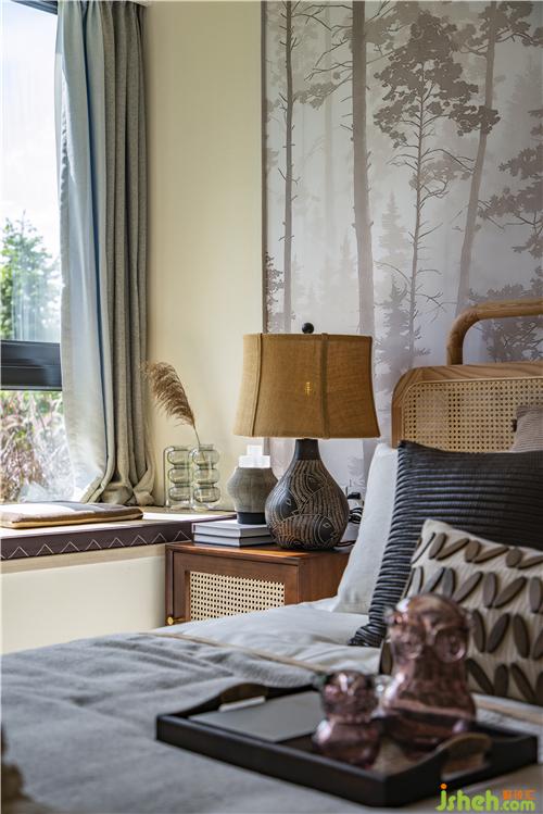 臥室墻面采用素色綴以復(fù)古紅,素雅之間又散發(fā)出摩登的復(fù)古感。天然藤編床為臥室增添了自然舒適的意味。精美的裝飾品讓一切柔和寧謐,沒有銳利的尖角,愜意休閑。