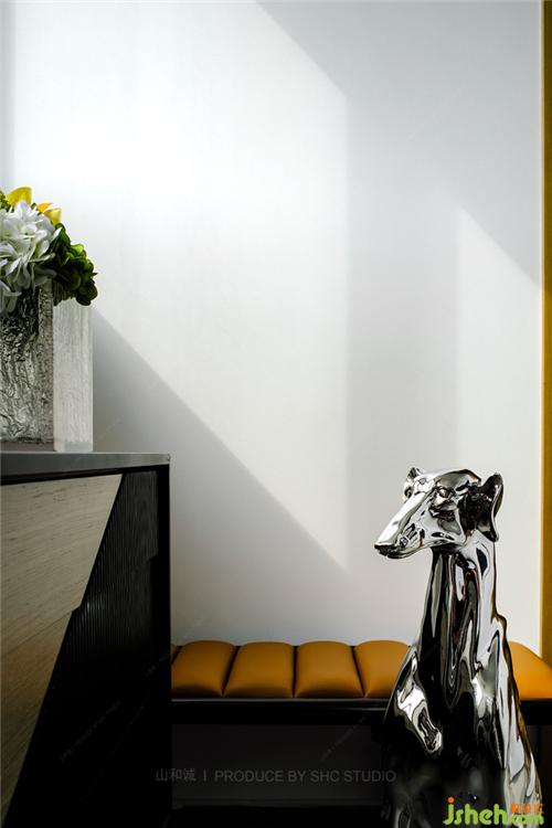 冷元寶先生使用愛馬仕橙色系加上高級灰鋪染出空間高端優(yōu)雅的精致之氣,黑白相間的大理石墻壁頗具流動感,藝術感十足的花瓶、生命力旺盛的綠植,點綴其間,層次分明,豪華的質感和整個圓滑的輪廓,無不彰顯出主人高雅的品味。