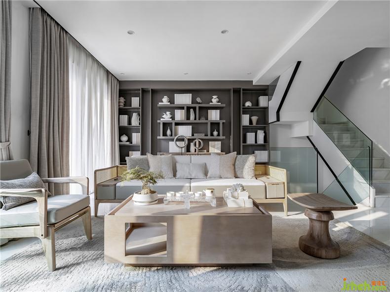 樣板房設計客廳留出一整面墻壁,將博古架進行現(xiàn)代形式的改良,陳列出主人的文化素養(yǎng)和高雅志趣。恣意生長的綠植、黑色線條與淺木色家具形成對比,流露藝術(shù)的極簡之美、空間的動靜之美