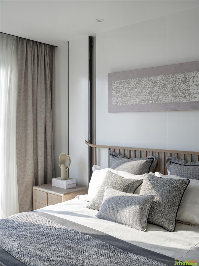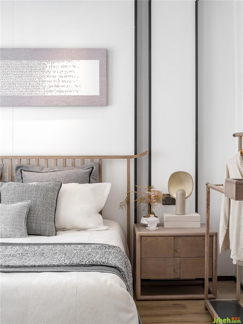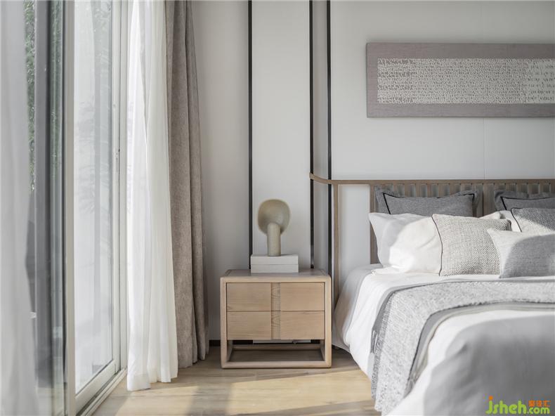 臥室,是人們真實的直面自我的空間,坦誠地面對自己,面對伴侶。整樣板房設(shè)計體空間優(yōu)雅舒緩,家具承襲明式家具的精粹,以纖細的線條強調(diào)出空間的靜美,線于線平行而又和諧的共處一室,亦如成熟而獨立的個體。