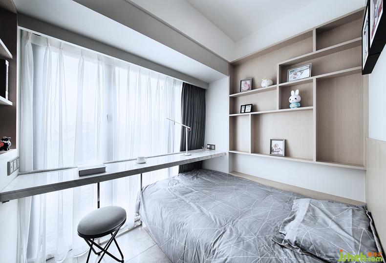 小孩房空間比較小,建筑墻體還不平,所以做了個(gè)閣物架,在落地窗前做一個(gè)寫(xiě)字臺(tái),這樣寫(xiě)作業(yè)的問(wèn)題就解決了,因?yàn)榭臻g小,床我也是現(xiàn)場(chǎng)做的,靠墻放。
