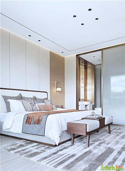 主臥無主燈設(shè)計(jì),天花四周洗墻燈帶,床頭防眩射燈,床頭背景點(diǎn)綴壁燈讓空間更溫馨。