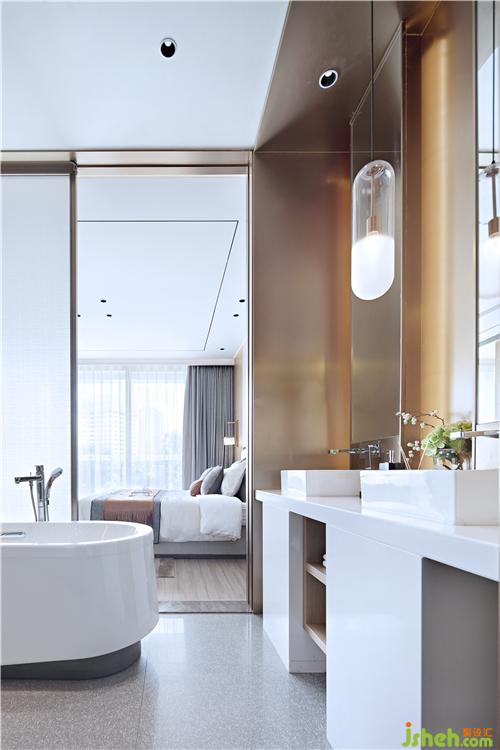 主衛(wèi)生間干濕分開,洗手臺(tái)背面材質(zhì)為不銹鋼,臺(tái)面人造石,燈光更注意細(xì)節(jié),有背景光,重點(diǎn)照明光和面部照明光。