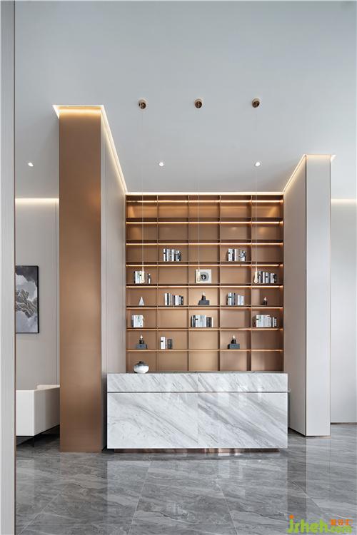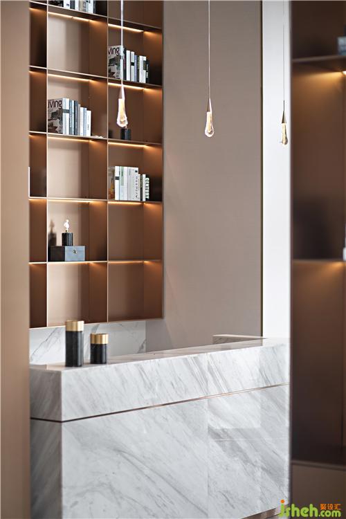 大理石臺(tái)的暖色金屬邊框呼應(yīng)著背后的金屬架,細(xì)節(jié)彰顯出統(tǒng)一和諧之感。
