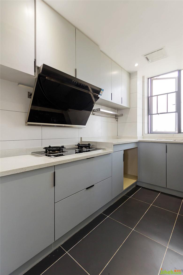 黑色地磚、灰色櫥柜、白色墻面與吊柜,黑白灰三色的過度簡約時尚,層次分明。