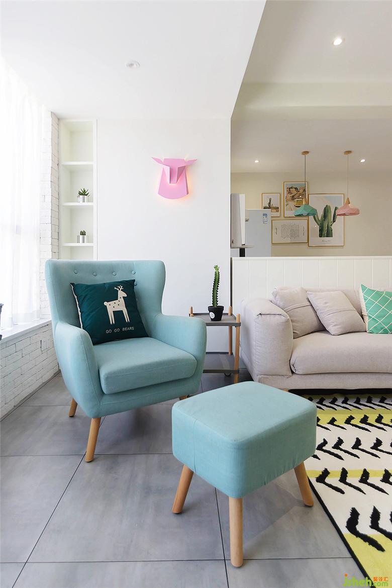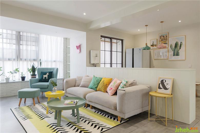 吧臺柜成為沙發(fā)背景,吧臺柜的設(shè)計,起著功能分區(qū)的作用,且在視覺上弱化了橫梁存在。米色一字形布藝沙發(fā),搭配簡潔的北歐風(fēng)茶幾邊幾,及糖果色抱枕、地毯,格外清新唯美。
