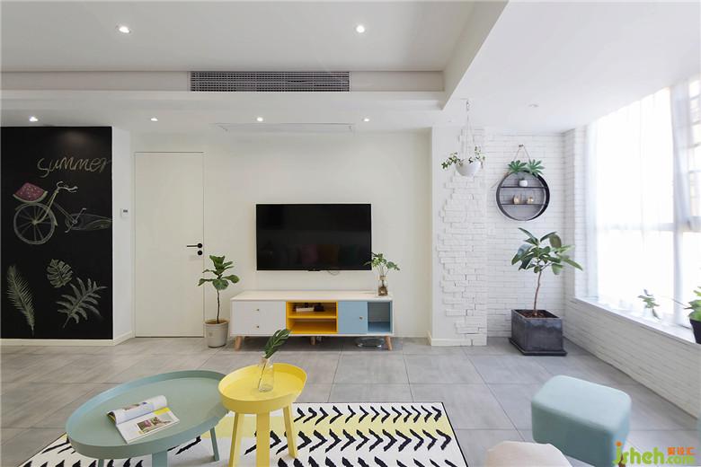 白色電視墻搭配跳色電視柜,與整體的格調(diào)一致。白色主臥門與背景墻一色,弱化了存在感,整體感更強(qiáng)。