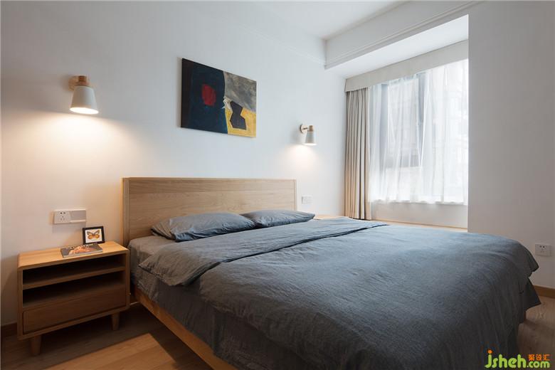 次臥,延續(xù)清簡(jiǎn)素樸的格調(diào),留白墻面搭配原木家具,油畫與壁燈與其他空間相互呼應(yīng)。