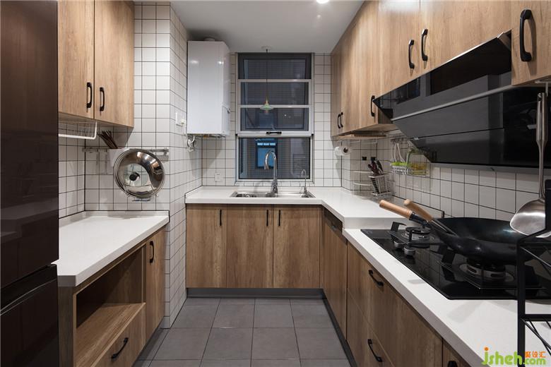廚房的功能動(dòng)線重新優(yōu)化,順時(shí)針方向的取洗切炒。洗切區(qū)域的臺(tái)面作了抬高處理,減少疲勞度。左邊的地柜空格里室內(nèi)設(shè)計(jì)師預(yù)留了插座,放微波爐用。