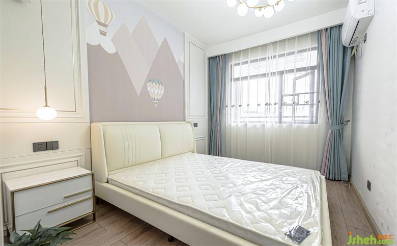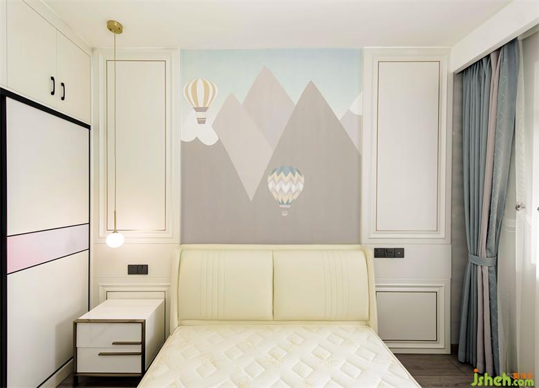 女孩房粉色調(diào)更為吸晴,床頭兩側(cè)墻板立體造型、裝修中間搭配童趣壁紙作為點綴,與屋外中性色調(diào)對比,少了點嚴(yán)肅,多了份溫柔。裝修