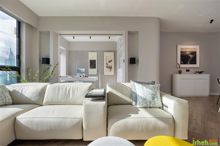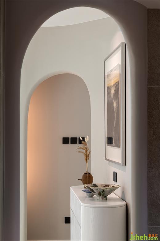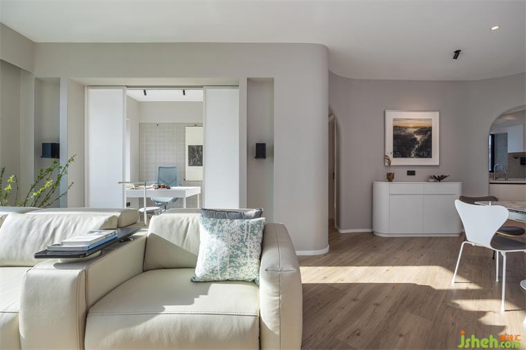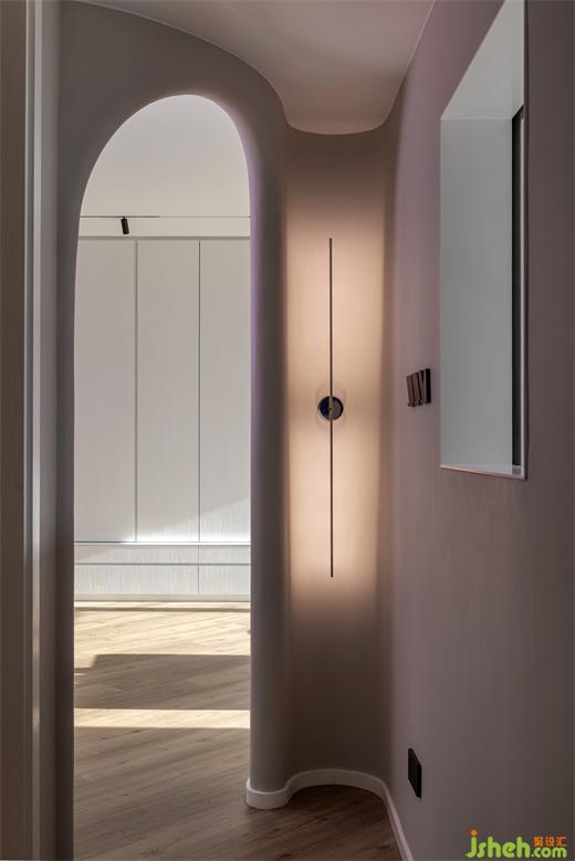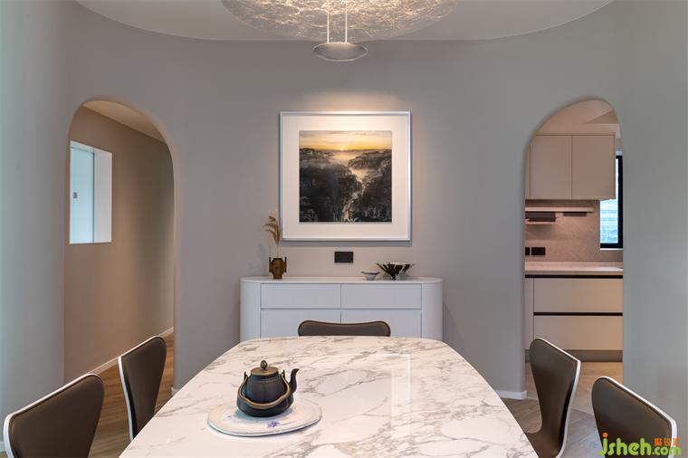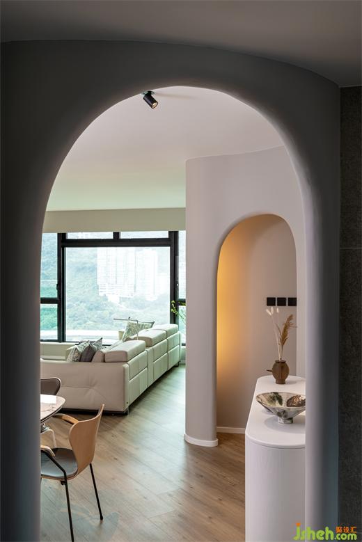 廖奕權(quán)唯一移動(dòng)的墻壁是將客用浴室與餐廳/客廳分隔的那堵墻;他將其推后以為更頻繁使用的公共區(qū)域提供額外的空間。重新定位墻壁意味著餐廳現(xiàn)在有了一些尷尬的角落,廖奕權(quán)認(rèn)為這些角落看起來不太舒服。他通過將它們變成優(yōu)雅的曲線來隱藏這些不雅的角落,并建造了兩個(gè)拱形入口,公寓設(shè)計(jì)分別通往走廊和廚房,而沒有門框。廖奕權(quán)通過使用帶有圓角的家具以及橢圓形餐桌上方的戲劇性圓形燈具來進(jìn)一步吸引人們對(duì)墻壁柔和形狀的注意。