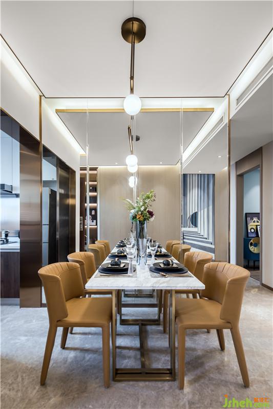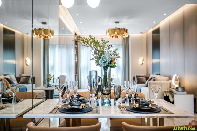 在最能體現(xiàn)生活儀式感的餐廳空間,金屬、玻璃和鏡面材質(zhì)的粲然光感完美交融,營造出空間的優(yōu)雅美好,凝結(jié)著都市生活的輕奢享受。