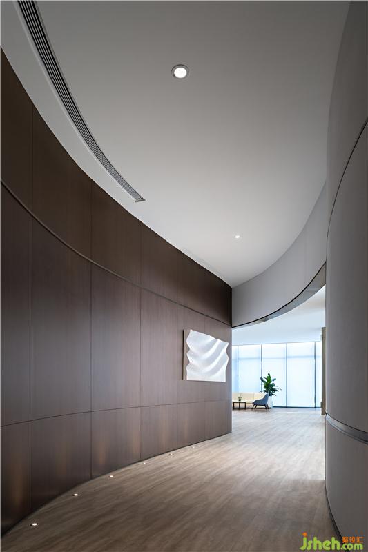步入空間,兩種不同質(zhì)感和風(fēng)貌結(jié)合而成渾然的優(yōu)雅,金屬銅色有歷史的厚和韻,光亮的白、線條的了然分明有自在的輕盈??臻g中,褶皺元素作為主體的裝飾元素被無(wú)限詮釋著,突破想象熟悉的邊界。設(shè)計(jì)師坦言:“對(duì)于某種純粹、簡(jiǎn)約和抽象形式美的追求,與直白的生活瑣碎保持一點(diǎn)距離,我們相信幾何有某種通向本質(zhì)的詩(shī)意。”簡(jiǎn)約元素與波浪褶皺紋理結(jié)合,裝飾畫變得立體,不再是某種形象的表達(dá),而更像是境的營(yíng)造,意在畫外。會(huì)所設(shè)計(jì)