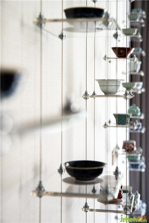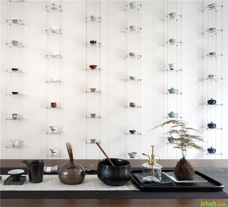 怡然自得的空間氛圍中,散逸著濃郁的人文氣息。設(shè)計(jì)師將幾十枚形制不一的杯盞陳列于一整面背景墻,精美的茶盞由此凸顯出獨(dú)到的藝術(shù)韻味,無(wú)用之美,在靜寂中流淌。