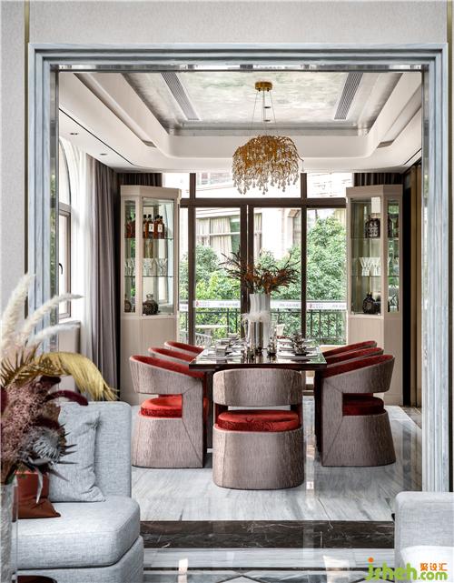 折衷美學(xué)講求比列均衡,注重形式美,設(shè)計師將這種特質(zhì)于餐廳空間中加以重點呈現(xiàn)。整體空間涵容著一種閑適的自信、沉淀著優(yōu)雅的韻致,墻面板與裝飾畫的搭配保留了一絲古典的豐神情韻,紅色靠椅搭配流光溢彩的餐桌和西式餐具,演繹日常生活的豐瞻之美。
