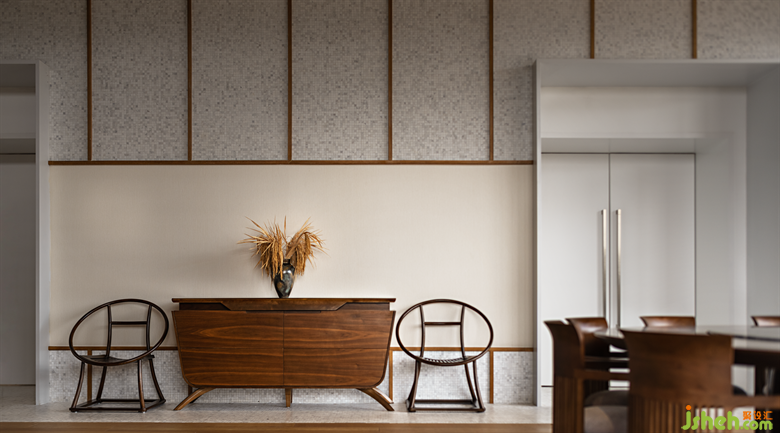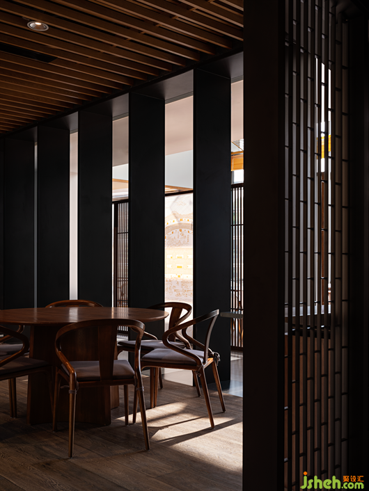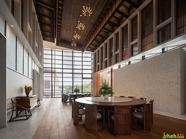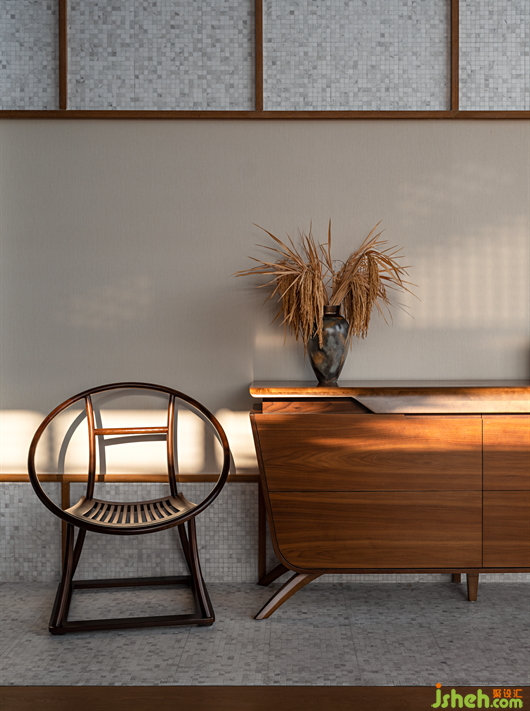 棕色的原木感染著一種寧靜沉穩(wěn)的力量,簡約內(nèi)斂的新中式家具搭配自然的花藝,共同創(chuàng)造出一種優(yōu)雅不失自然、樸質(zhì)不乏尊貴的場所精神。