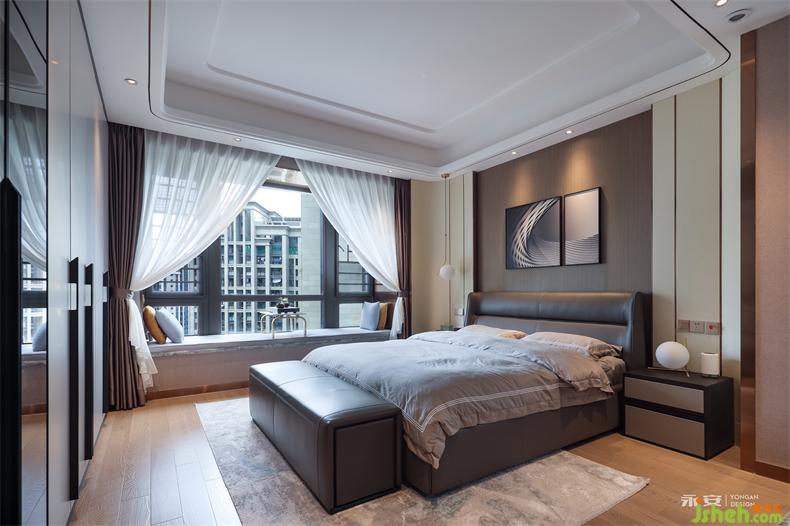 主人房是刻畫(huà)的重點(diǎn),米咖色的色調(diào)與空間的暖白帶來(lái)全新的視覺(jué)體驗(yàn),深圳豪宅設(shè)計(jì)米白色床頭皮質(zhì)花紋硬包背景,像一曲悅耳的旋律,演繹空間的品質(zhì)與格調(diào)。整個(gè)主臥空間以飽和度較低的色調(diào)為基底,大量的硬包材質(zhì)材質(zhì),搭配黑色、灰色床與床品,時(shí)尚不失簡(jiǎn)約。綠色床品的鋪設(shè)不禁令人眼前一亮,又不覺(jué)突兀,與純白色相襯下,深圳豪宅設(shè)計(jì)使得本就良好的采光更為室內(nèi)營(yíng)造出潔凈溫暖的視覺(jué)感受。