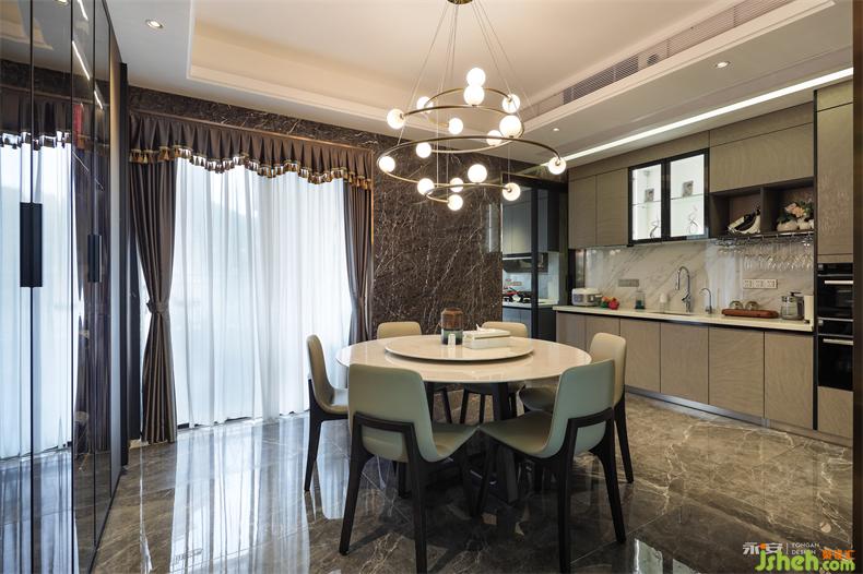 開(kāi)闊明餐廳,軟裝設(shè)計(jì)強(qiáng)調(diào)審美在外質(zhì)感在內(nèi),深圳豪宅設(shè)計(jì)與客廳同源的背景裝飾畫(huà)為空間注入輕盈靈動(dòng)氣質(zhì)。充滿設(shè)計(jì)感的餐桌、翠綠色餐椅傳遞優(yōu)雅儀式感,醞釀出現(xiàn)代詩(shī)意。天然大理石臺(tái)面搭配具有裝飾線條感及簡(jiǎn)約、節(jié)省空間的桌腳設(shè)計(jì),有助于于餐椅的擺放使用方便性。