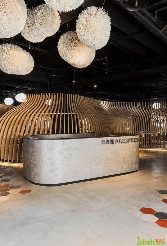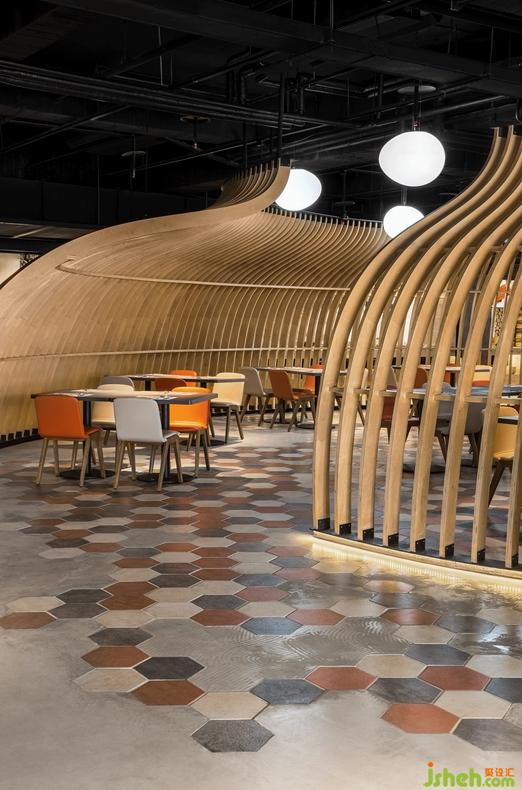 進入營業(yè)區(qū),屋頂和地面以極簡方式呈現(xiàn),退為背景,素水泥平滑無縫,六角磚以組團形式嵌入其中,活潑清新,這一切手法都為襯托空間造型做好準(zhǔn)備。
