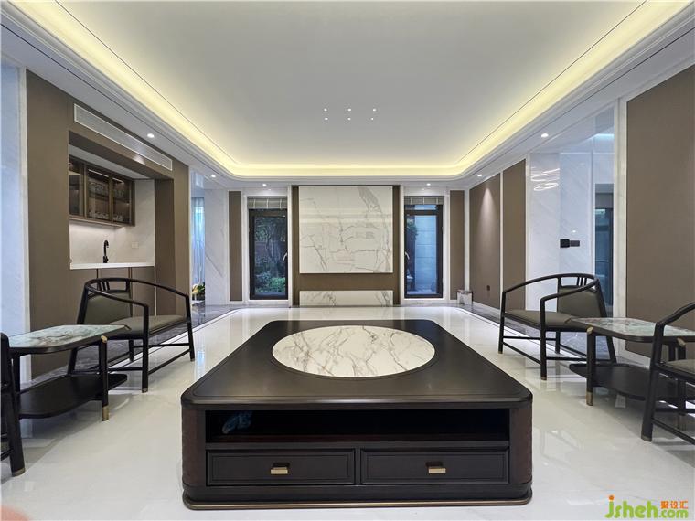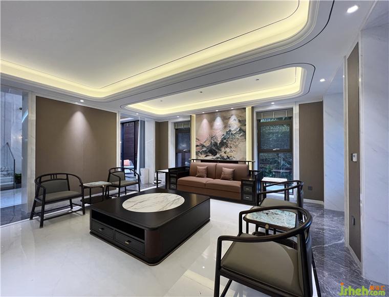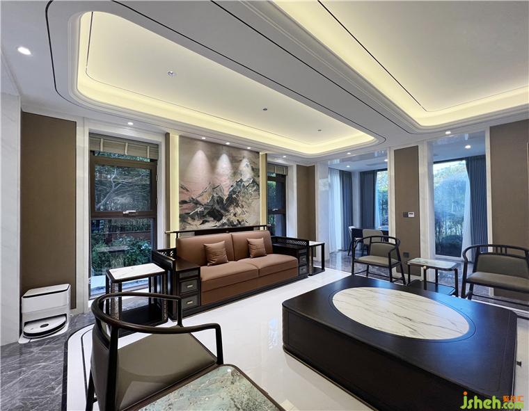 客廳采用大面積落地窗設(shè)計,梧桐書舍設(shè)計讓窗外層巒疊嶂的山水景觀一覽無余,將柔和情調(diào)展現(xiàn)得淋漓盡致,讓業(yè)主能夠享受生活中難得的浪漫詩意。