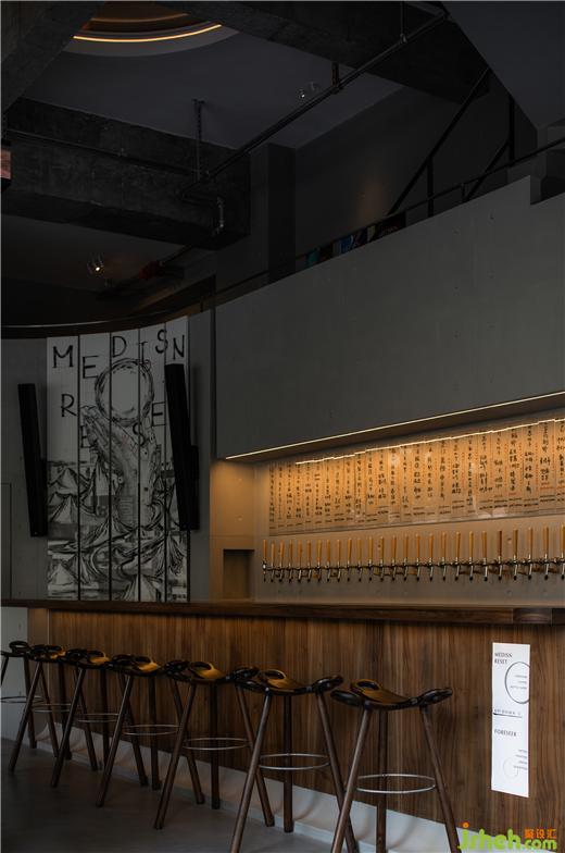 這里悄悄隱藏著一種致力于將簡化作為藝術(shù)蛻變的結(jié)果,不易被察覺,但進(jìn)入空間的人能明確感受到視覺感知在這里被一種更能喚起知覺力量的觸覺所替代,成都藥廠精釀酒吧設(shè)計空間的序列、層次、肌理、質(zhì)感,成為“肌膚之目”中所謂的對象物,物質(zhì)與意識從對立面走向了統(tǒng)一。