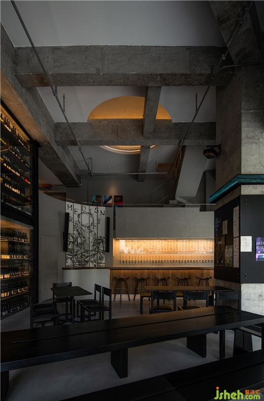 在這個雕塑感強(qiáng)烈的、有著通高天花板的空間內(nèi),空間的尺度關(guān)系從一般經(jīng)驗(yàn)中被放大,成都藥廠精釀酒吧設(shè)計為了增強(qiáng)這種大尺度的戲劇體驗(yàn),設(shè)計上利用垂直空高的優(yōu)勢,將酒類陳列于室內(nèi)視覺的開放區(qū),形成一個立體的、矩陣式結(jié)構(gòu)的6米高玻璃酒房。人在酒房的狀態(tài),既體現(xiàn)為一種對空間尺度的丈量,也暗合著一種對酒精烈度的丈量。