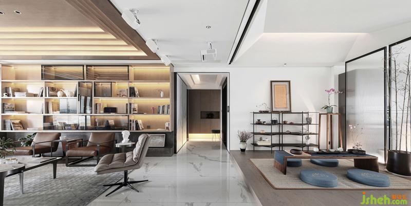 “奕賢居”由電梯廳入戶,拉開雙門看到眼前一幅背景,為一進(jìn):“見山是山,見水是水”的意境。