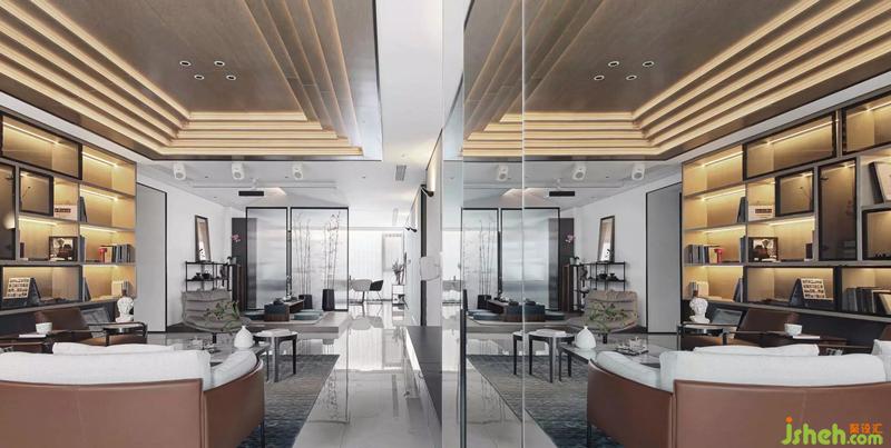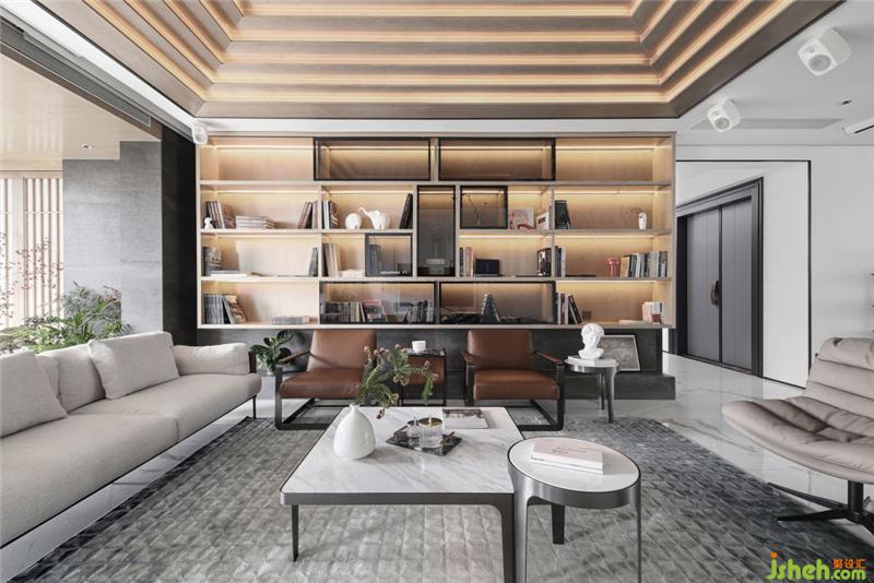 整面書架結(jié)構(gòu)作為客廳的中堂,當(dāng)中呈現(xiàn)出“正”字背景。這是父親留下的做人做事立于“正”字根本,“凜然正氣,天地合一”,取其意、取其境、用其韻。“正”字前方有兩張現(xiàn)代單人椅為正坐南京裝修設(shè)計(jì),家訓(xùn)時刻提醒著主人夫婦。頂面結(jié)構(gòu)依然保持對稱,層疊出五個層次,象征五行之?dāng)?shù):“循環(huán)相生、剛?cè)岵?jì)”。設(shè)計(jì)另比作是“年輪”,有成長的寓意。一個居所要有生命體系,就好比樹木一樣,在自然中應(yīng)生機(jī)盎然,因此所用的材質(zhì)是胡桃木,自然的紋理充滿著生命的有機(jī)力量。