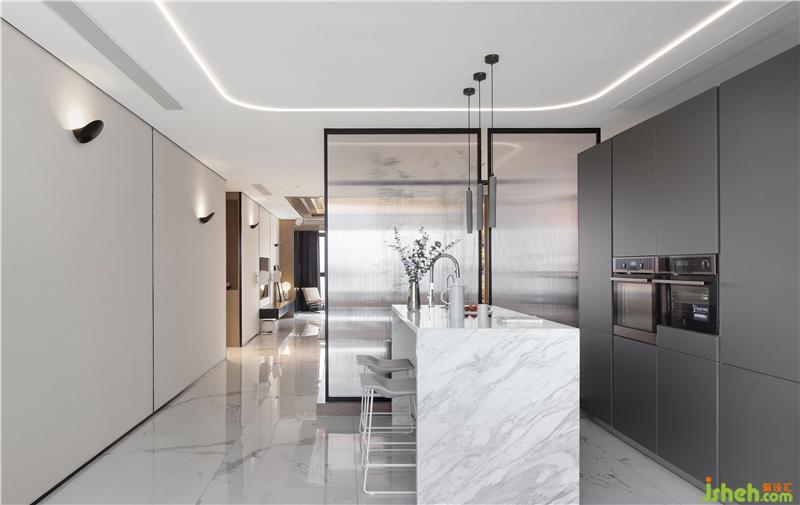 東方自然語境與西方表現(xiàn)主義融合,構(gòu)建空間“海納百川,有容乃大;壁立千仞,無欲則剛”的精神氣質(zhì)。延續(xù)客廳部分有一個自由空間:開放式茶室或書寫室。被地面抬高的木地板作為空間界定,雖為獨(dú)立空間,卻無私密的遮擋,刻意設(shè)計(jì)在客廳與餐廳之間。設(shè)計(jì)師的用意是借空間自由式連接,是他提出“空間是自由的”結(jié)論。自由中人的行為及動作自覺性的完成,盤坐或靜坐正是中國傳統(tǒng)修心養(yǎng)生的一種方式,以達(dá)到人的“禪定”。上方的人字斜頂將光藏在夾縫里,反射在空間范圍,仿佛一道撫慰的光,指引著人的內(nèi)心深處。溝通“人與天地”,感悟生活的寫實(shí),需要一種自覺的放松。