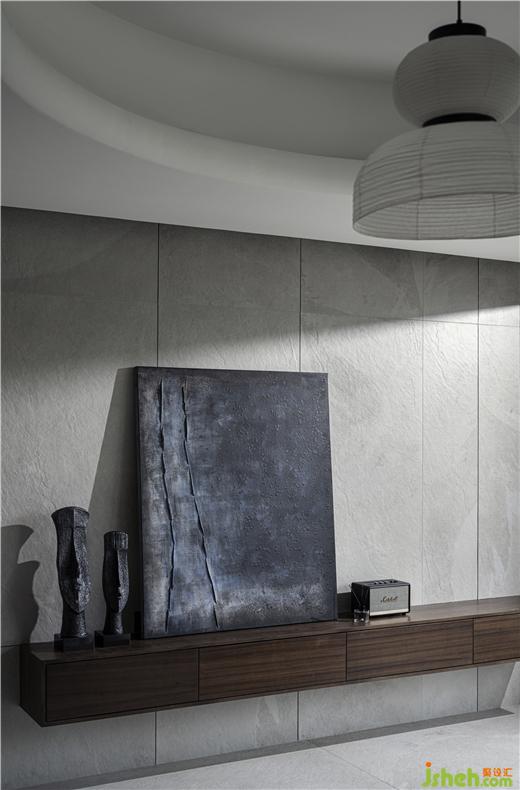 家裝設(shè)計(jì)以亞馬遜綠巖板背景墻引入,正中為浮雕三角錐形式的矩形柜,其上的干花隨性散漫,自由與慵懶撲面而來(lái),同時(shí)具有延展性的兩條線形燈光勾勒出空間的輪廓感,加強(qiáng)整體的視覺(jué)亮點(diǎn)。