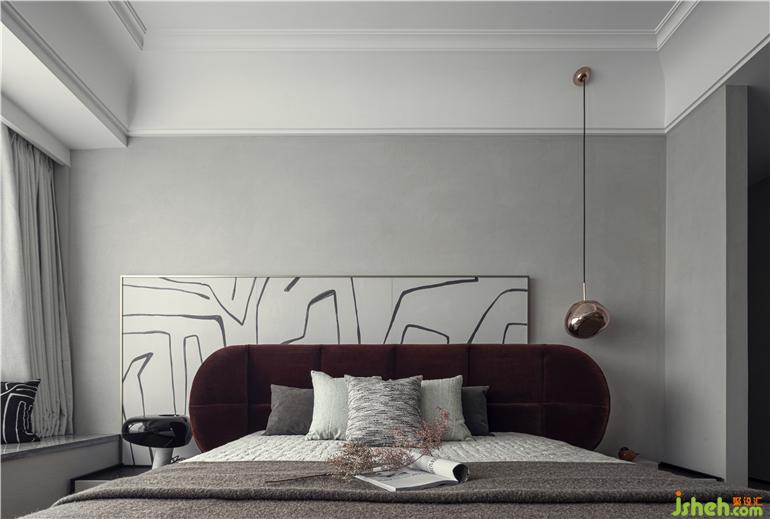 主臥以半高的黑白筆觸屏風(fēng)作為床頭背景,頗顯隨性自由的態(tài)度。家裝設(shè)計(jì)以棕紅色飾面為主,點(diǎn)綴金屬質(zhì)感裝飾,和柔軟的灰色床品共同營(yíng)造出舒適優(yōu)雅的休憩空間。