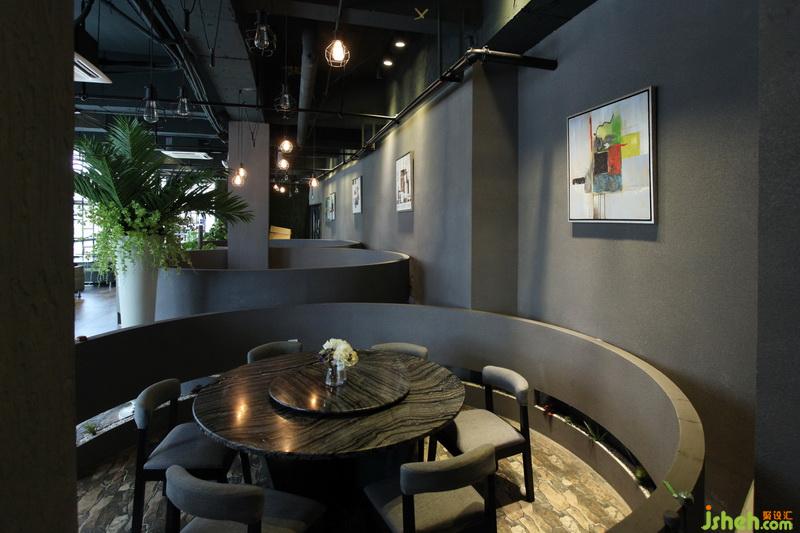 本案其實是休閑中餐廳,但業(yè)主希望改變餐廳設(shè)計的風格,既能在有限的資金下,符合當下年輕人的潮流。于是,在公共區(qū)域,餐廳設(shè)計定位為工業(yè)風格,同金屬玻璃幕墻相得益彰,鍍鋅方管焊接的隔斷刷成黑色,深綠色的皮沙發(fā)等都是深色系,故采用玻璃球的吊燈,讓視覺上有個反沖。夜晚,這些個球燈亮起,猶如星光點點。包廂的做法,是新中式的元素疊加,水墨畫的隔斷及竹編的吊燈,使整個包廂凸顯山水人文氣息。