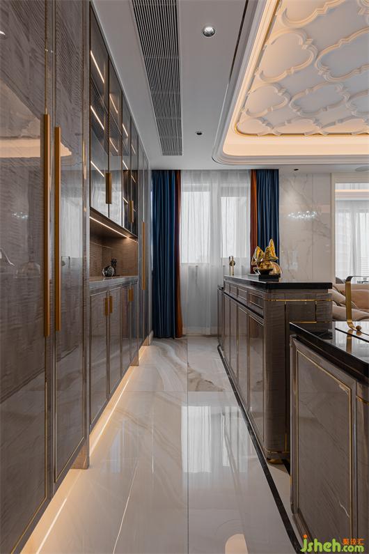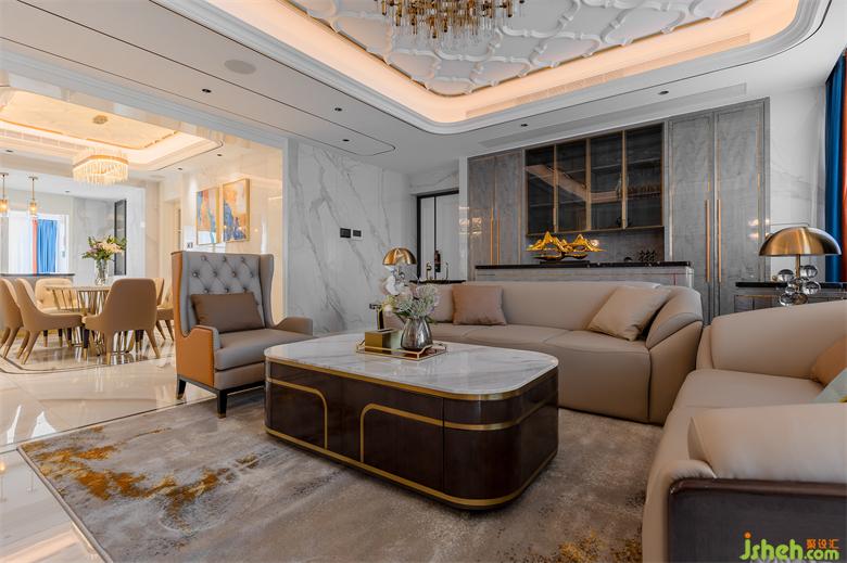 客廳區(qū)域的背景墻以大板奢石瓷磚為主,左右兩邊采用暖白色調(diào)的護(hù)墻板鑲嵌金屬線條,大平層設(shè)計(jì)沙發(fā)背后的端景柜與裝飾柜采用灰影飾面做造型,天花造型搭配金屬水晶吊燈,整體大氣又不張揚(yáng),時(shí)尚家具點(diǎn)綴金屬線條與軟裝合理搭配,使得整個(gè)空間奢華感倍增。