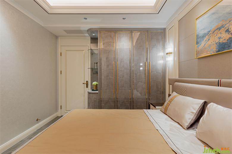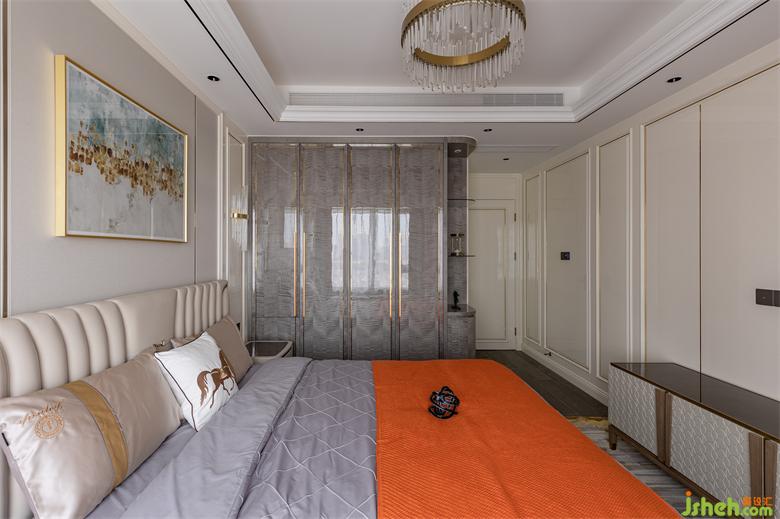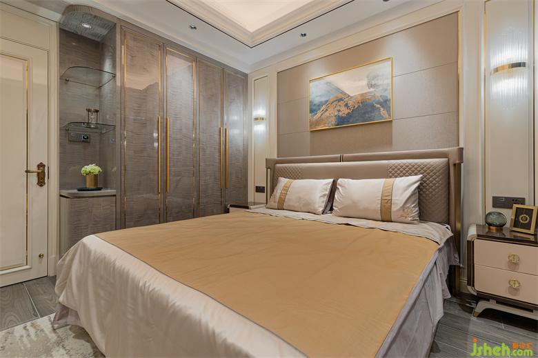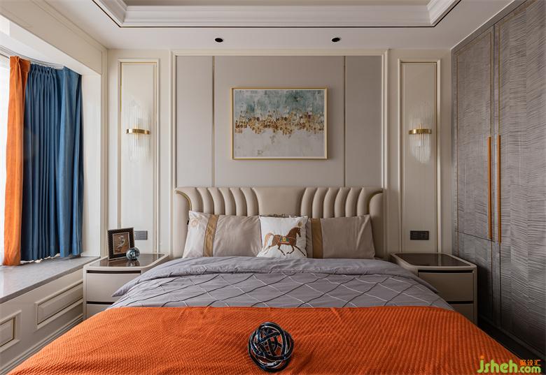 大平層設計主臥區(qū)域以暖白色護墻板為主,床鋪背景搭配素色硬包,藝術掛畫、水晶壁燈及床品的合理搭配,既營造出溫馨浪漫的休息空間,又使得整個主人房更加柔和、高貴、優(yōu)雅。