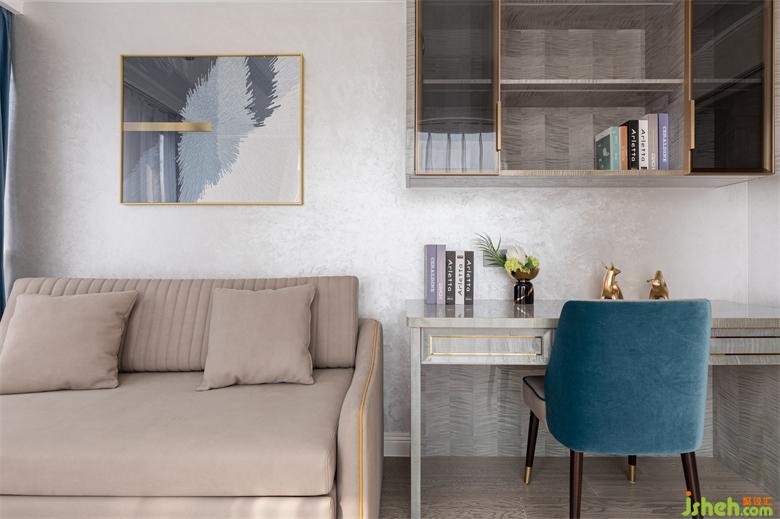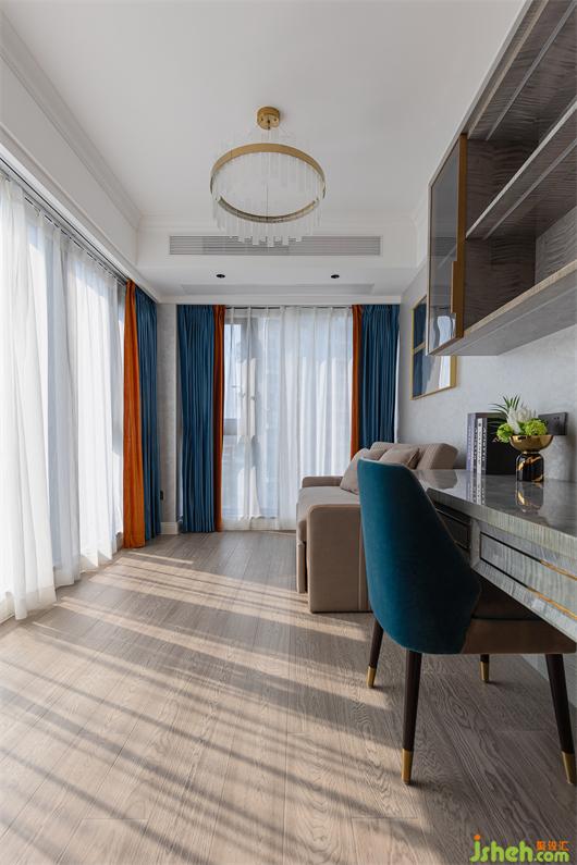 多功能房兩面落地窗光線十足,大平層設計整體以灰藍色調(diào)為主,書桌、休閑沙發(fā)床搭配原木色的地板和設計感十足的窗簾,在這里辦公、讀書、休息,都是一種極大的享受……