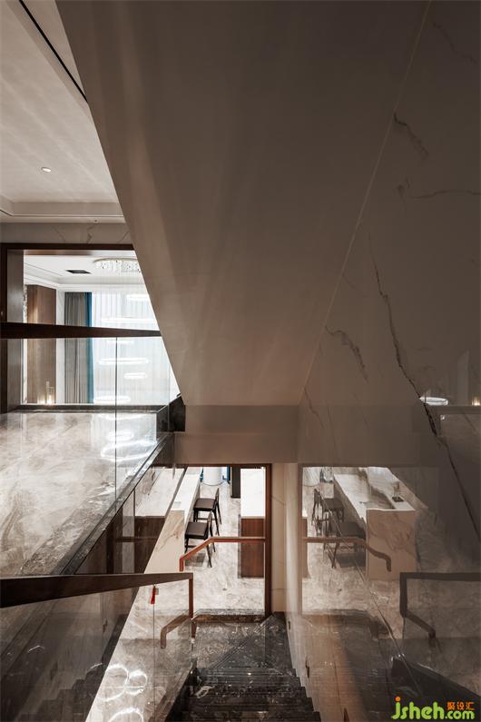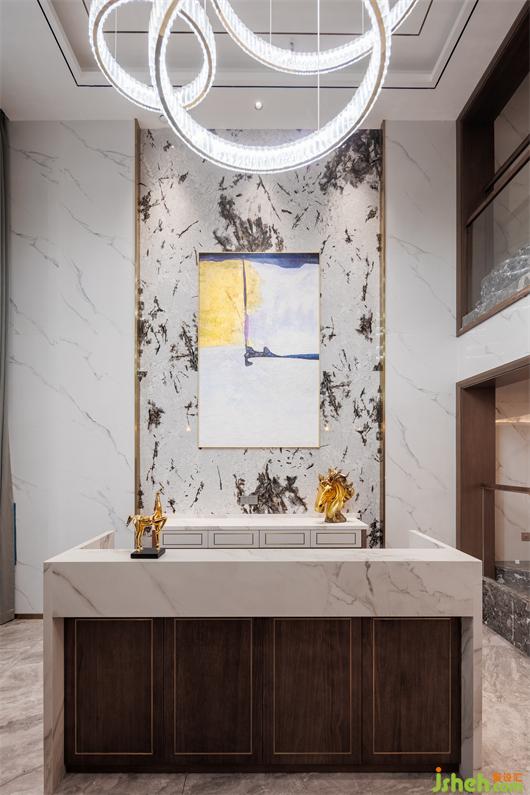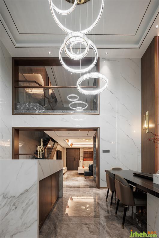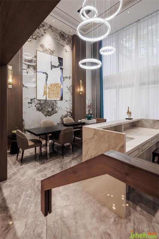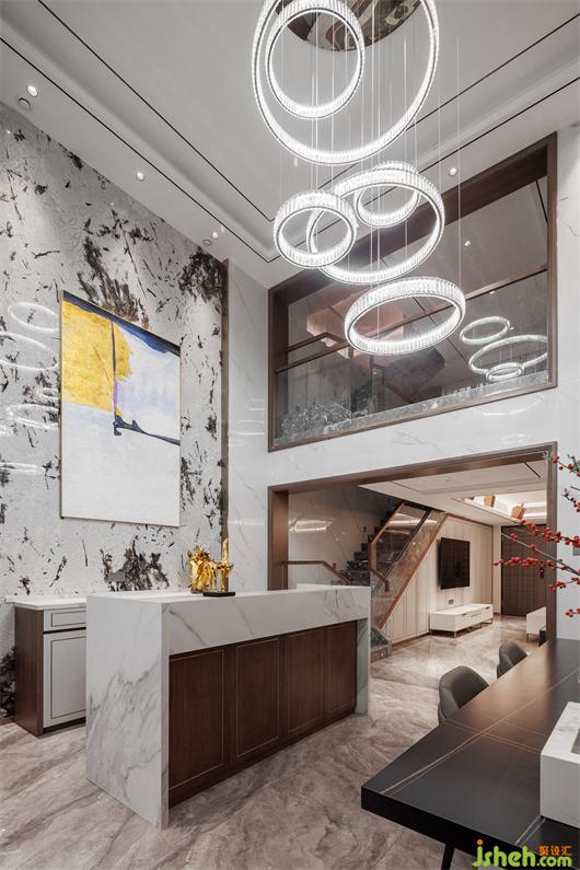 開放式餐廚空間,簡練線條托起華美肌理,別墅設計色調(diào)與材質(zhì)呈現(xiàn)珠聯(lián)璧合的疊加魅力,兼以藝術裝飾調(diào)味精致細節(jié)。