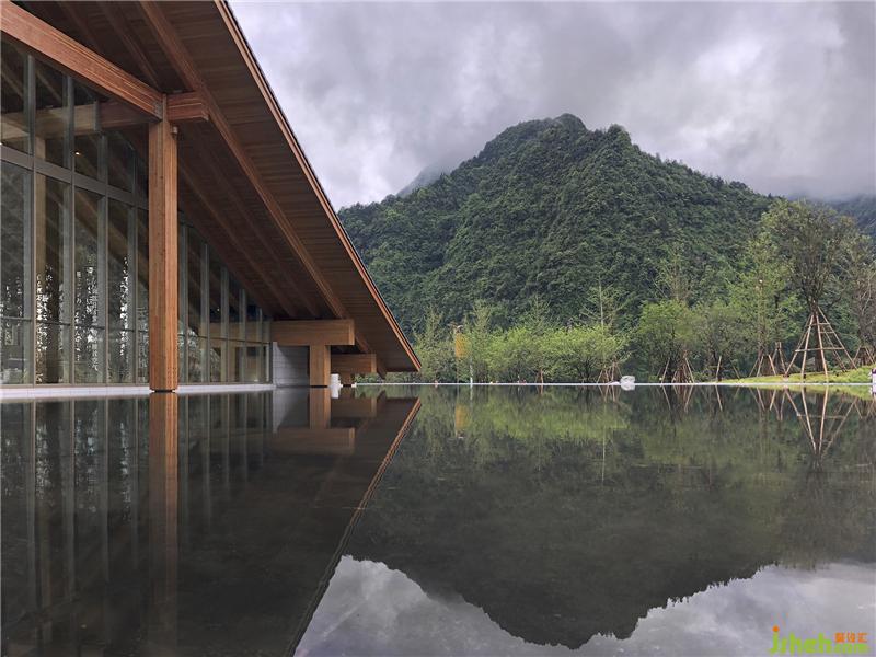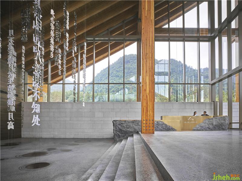 云山藝術(shù)館座落于重慶四面山景區(qū)中,藝術(shù)館建筑之初,設(shè)計(jì)師結(jié)合當(dāng)?shù)厮娝?,從自然之間提煉了水、木、石、天的元素,并進(jìn)行空間藝術(shù)化處理,自然而然地融合成一種忽逢桃花林之感。