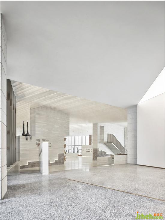 水流的蜿蜒流動(dòng),如同紐帶,串聯(lián)起了空間中的新媒體,引導(dǎo)人們進(jìn)入新的空間,伴著水景向下感受水面與建筑的互動(dòng),在轉(zhuǎn)角處,進(jìn)入開闊的藝術(shù)館前廳。