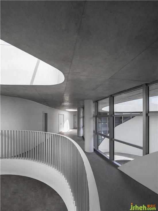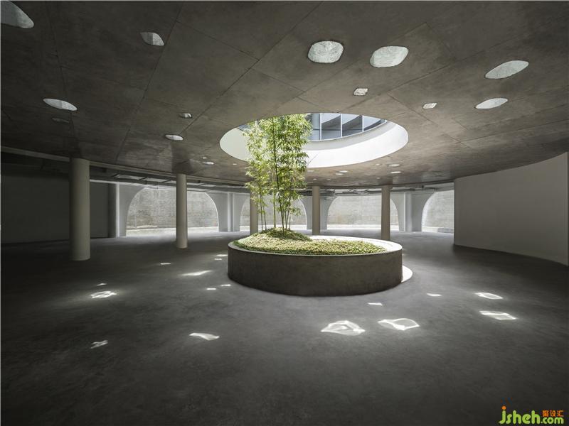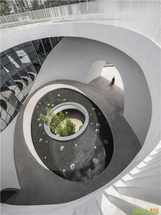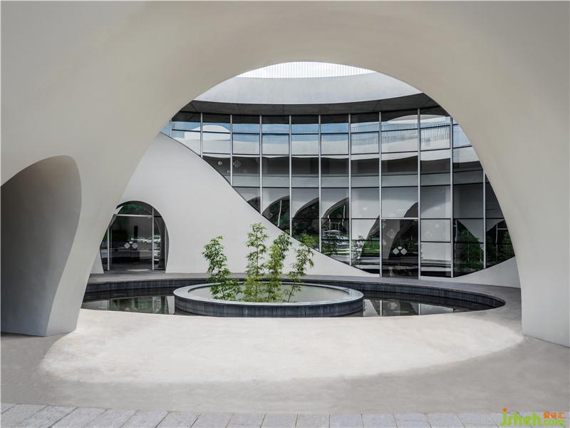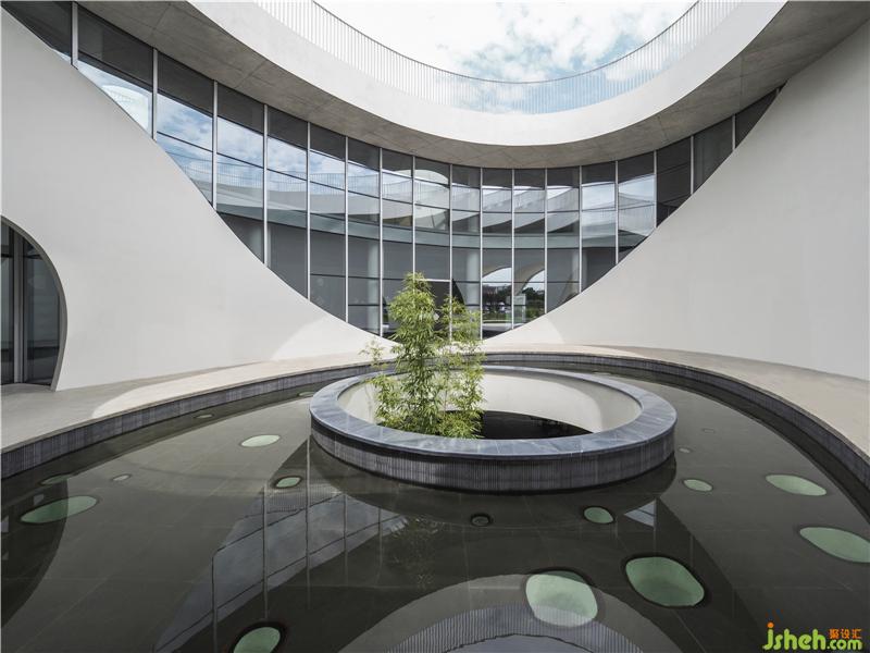 由經(jīng)開孵化園入口不遠(yuǎn)處,首先會(huì)看到一棟白色小樓,潔白的建筑表面,有機(jī)排列著水滴形開窗,在陽光照射下閃爍。半月形的水池由上而下構(gòu)成了流瀑,水聲洗滌著過往的喧囂;半圓形的大門與圓形地臺(tái),上下呼應(yīng),形成鏡花水月的隱喻。穿過門洞抵達(dá)內(nèi)部中庭,映入眼簾是一個(gè)偌大橢圓形水池,天光從水面反射于周圍弧形玻璃窗,在白墻上留下光景。水池中的圓洞,形成與地下相連的天井,微露出青蔥的竹子。光透過竹葉與池底的菱形玻璃,伴隨著下方樹影婆娑的光波點(diǎn),譜寫出奇妙的水光協(xié)奏曲。小白樓的中空部分保留給了天與地,伴隨光影時(shí)序變化,再現(xiàn)幽玄的自然境界。