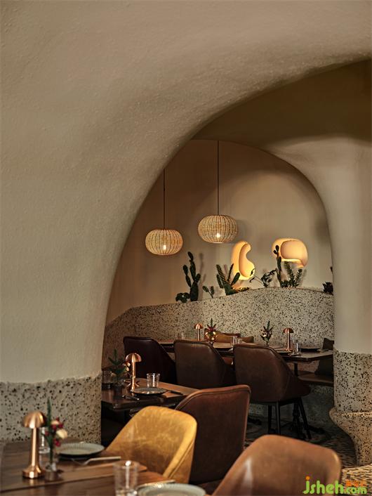西班牙餐廳設(shè)計(jì)相對于當(dāng)下流行的侘寂風(fēng)當(dāng)中,以使用單一材料和極為嚴(yán)謹(jǐn)?shù)胤绞讲季钟?jì)算出的禪寂感,蘭巴赫幾乎是以反其道而行成的方式觸達(dá)了另一種繽紛感。蘭巴赫室內(nèi)空間中使用的材料非常豐富,光是地面就使用了拼花磨石子、實(shí)木地板、碎拼大理石、鵝卵石地面、拼花馬賽克等多材料組合,最終呈現(xiàn)出像是一幅拼貼藝術(shù)畫一樣的視覺感官。