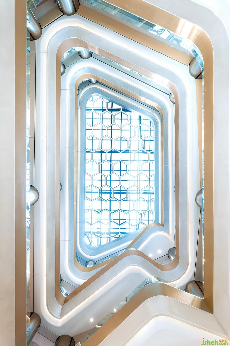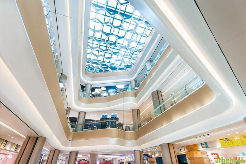六邊形花窗是蘇州園林的視角,適宜的距離和角度,框取自然之美,或掩映自然之美,生活便因此有了詩意。設(shè)計公司中庭天花以六邊形整齊排布的幾何圖形為裝飾,與樓層天花上六邊形的花瓣,進行著陽剛與陰柔的對話。