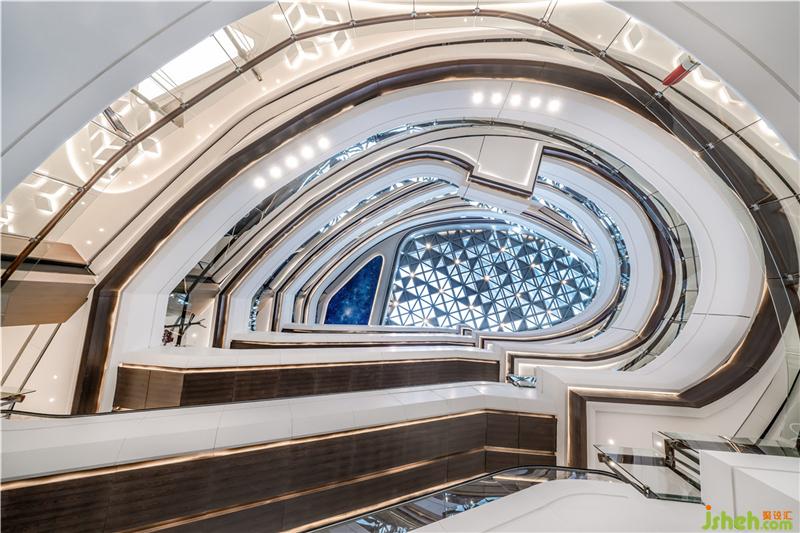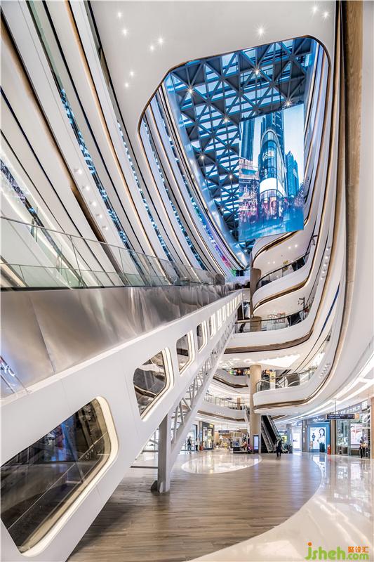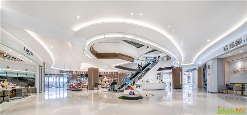 空間整體狹長(zhǎng)有余、空曠不足,如何營(yíng)造整體的流暢感,并在這個(gè)基礎(chǔ)上形成高效的人流動(dòng)線,提高空間的使用率,成為設(shè)計(jì)要解決的首要問題。在商場(chǎng)的主中庭,LB凌奔設(shè)計(jì)架起一座從一樓直通五樓的“飛天梯”,達(dá)到了最高效的人流輸送。這對(duì)于一個(gè)規(guī)模100000㎡的商業(yè)綜合體意義重大,意味著最大客流接待能力10%的提升。